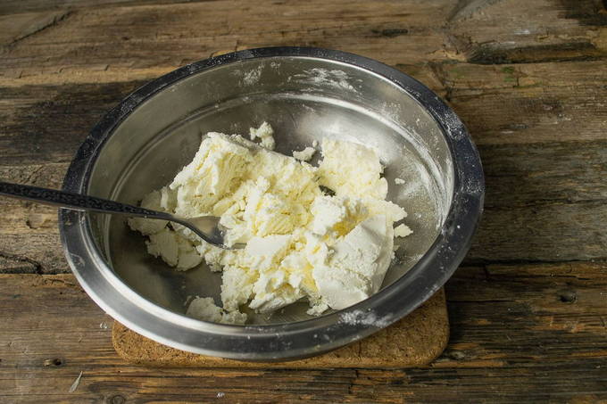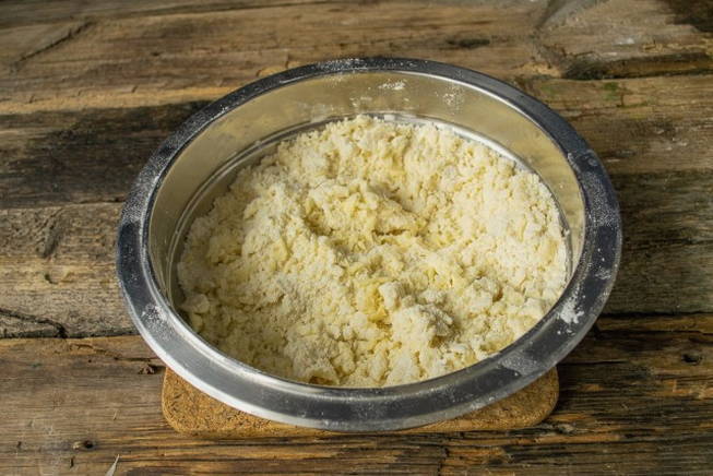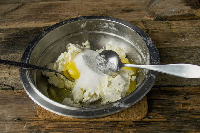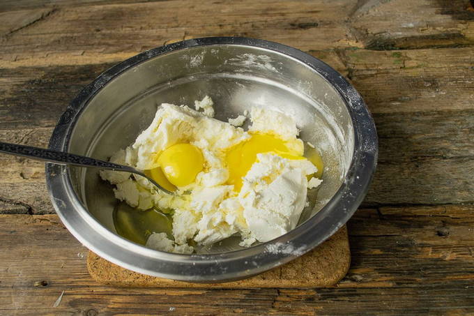 - Voeg vervolgens de eidooiers toe, kneed de massa met je handen tot een gladde, dichte klont is gevormd. We verwijderen het werkstuk een tijdje in de koelkast.