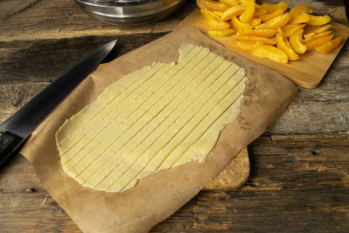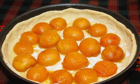 - Verdeel de abrikozen in kleine partjes. We verspreiden ze op een laag deeg.