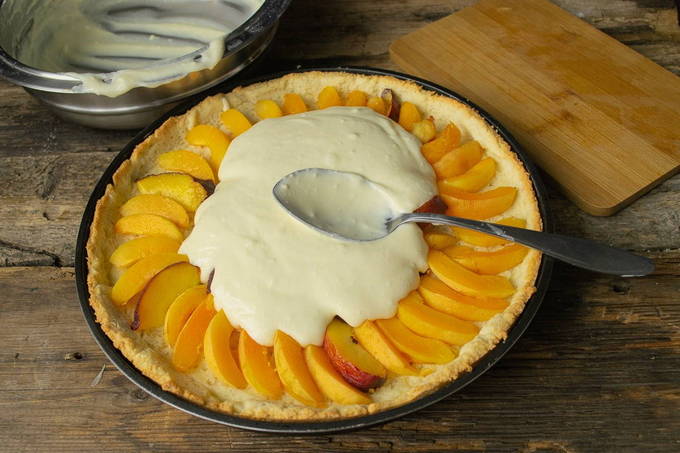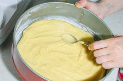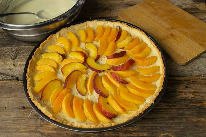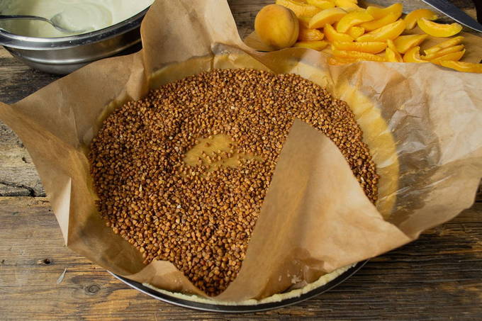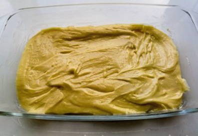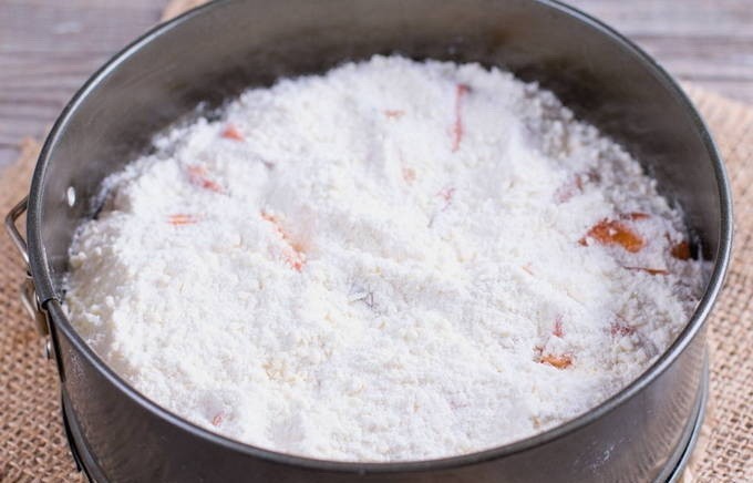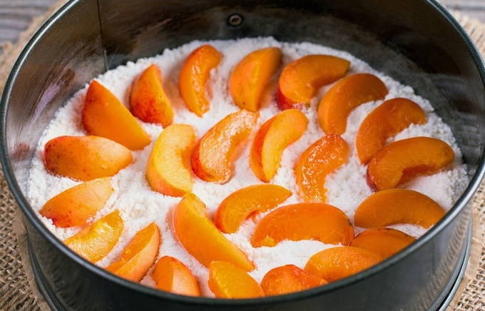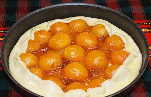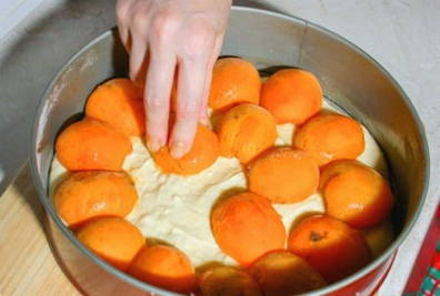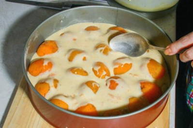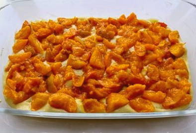 - Giet de helft van het deeg in een ovenschaal. Leg de vulling van ingeblikte abrikozen erop. Vul het product met het resterende deeg.
