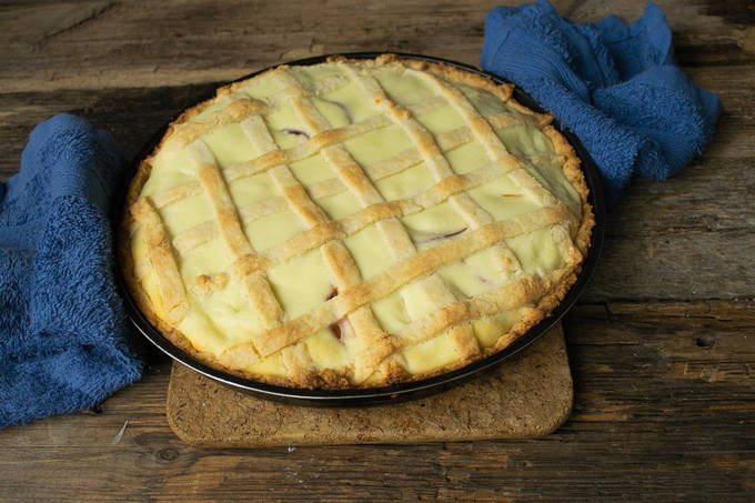 - Huisgemaakte taart met wrongelvulling en abrikozen is klaar. Verdeel de traktatie in porties en serveer!