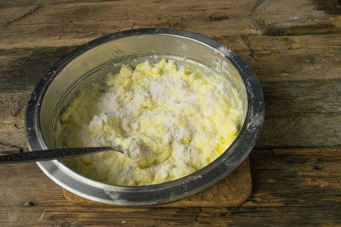 - Voeg hieraan gezeefde bloem met bakpoeder toe. Kneed tot een homogeen deeg is verkregen.