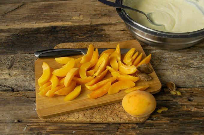 - Laten we de abrikozen klaarmaken. We ontdooien ze van tevoren en snijden ze in kleine stukjes.