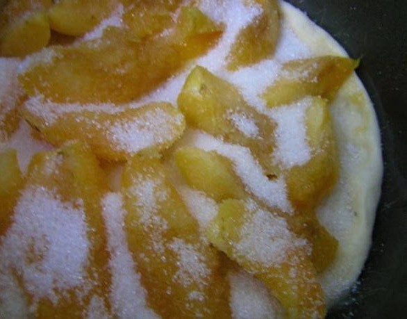 - De plakjes moeten gelijkmatig verdeeld zijn. Maak de resterende lepel suiker klaar.