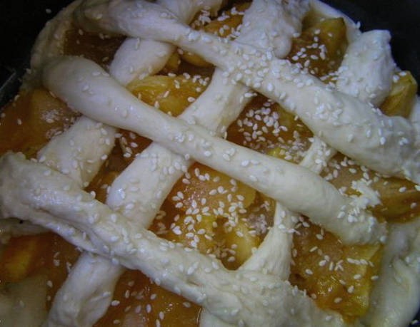 - Verdeel het resterende deeg in kleine reepjes. Bedekken of vullen. Strooi sesamzaadjes over de cake en zet deze voor 40 minuten in de oven. Koken op 180 graden.