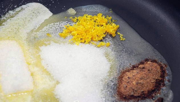 - Smelt de boter en bak hierin de resterende suiker, kaneel, vanille en citroenschil. Koken tot siroop is gevormd.