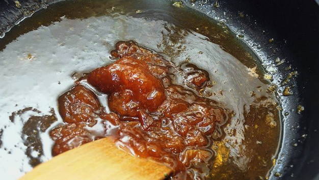 - Haal de abrikozen uit de pan. Voeg jam toe aan de siroop, roer en kook nog 1-2 minuten.