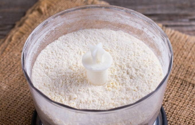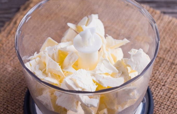 - Snijd de boter in kleine stukjes. We dompelen ze onder in de blenderkom.