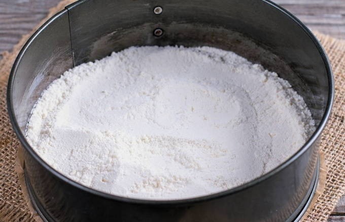 - Zeef de bloem in een diep bord en roer het met bakpoeder en poedersuiker.