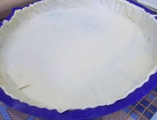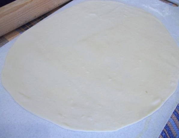 Ontdooi het bladerdeeg vooraf. Scheid een klein stukje van het product voor decoratie. Rol de rest op tot een dunne ronde laag. We gebruiken bloem om te voorkomen dat het deeg gaat plakken.