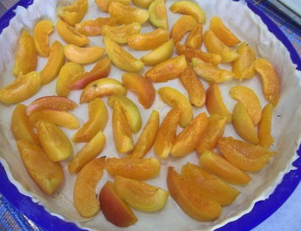 Snijd de abrikozen in dunne plakjes. Doe het product in een vorm met deeg. Bestrooi de vulling met suiker.