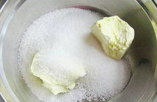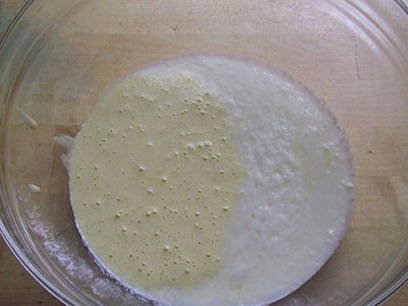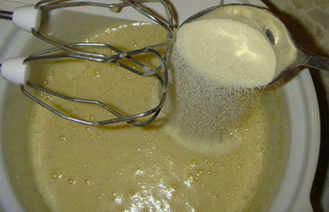 - Klop de overige eieren, zout en 80 gram suiker apart los. Voeg vervolgens zure room en gesmolten boter toe.