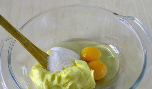 - Klop in een kom het ei met suiker los, voeg zout, vanilline, kefir, bakpoeder en gezeefde bloem toe. Smelt de boter op laag vuur, laat afkoelen en giet in een kom met deeg, roer.
