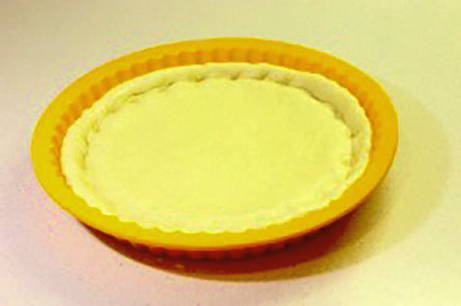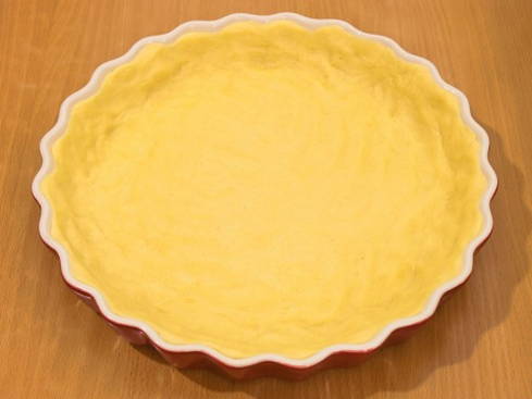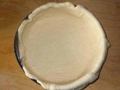 - Rol het grootste deel van het deeg uit tot een ronde bodem voor de taart en leg deze in een vorm, maak kleine zijkanten. Dek de vorm af met huishoudfolie en laat het deeg 20 minuten staan.