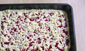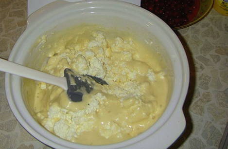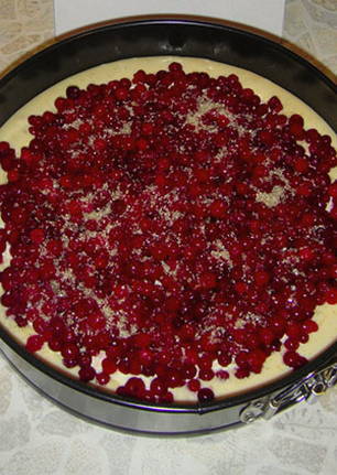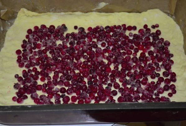 - Leg het deeg in een ingevette vorm, leg dan de wrongelvulling, giet de bessen erop, vermengd met een eetlepel suiker.