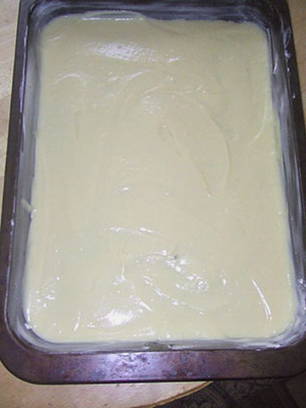 - Giet het gieten over de hete taart, laat het bakken 3-4 uur in de koelkast staan. De taart is sappig en smakelijk.