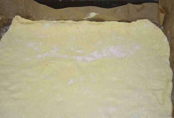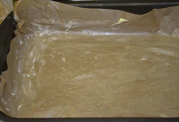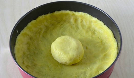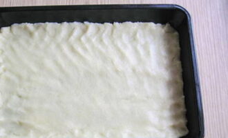 - Leg het deeg in een ingevette vorm, verdeel het deeg over het hele gebied, maak lage zijkanten.
