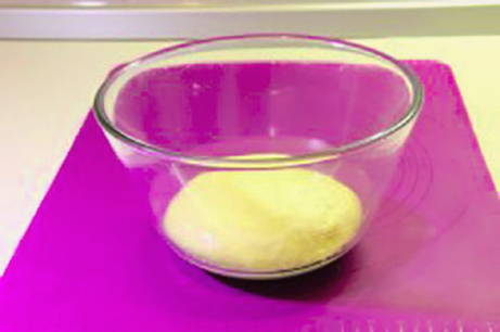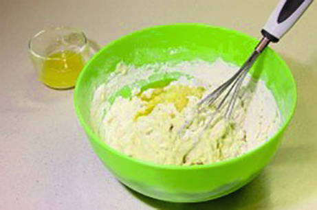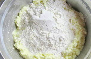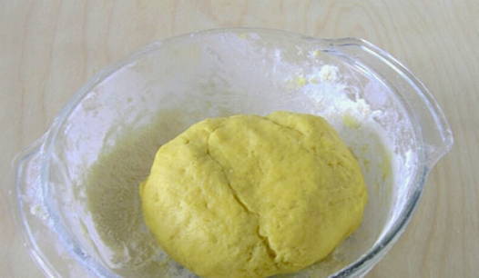 - Giet de gezeefde bloem en bakpoeder in een kom, kneed tot een homogeen deeg.