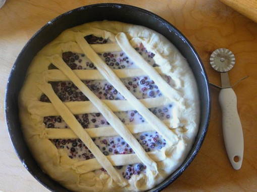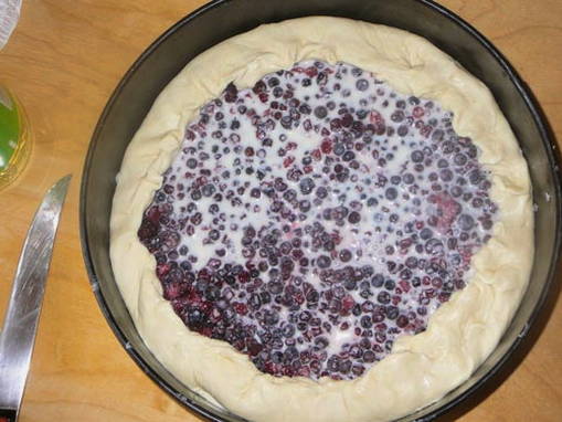 - Bereid de vulling voor. Meng de bosbessen met het zetmeel en de suiker. Leg het resulterende mengsel op een gistdeegbodem.