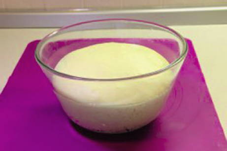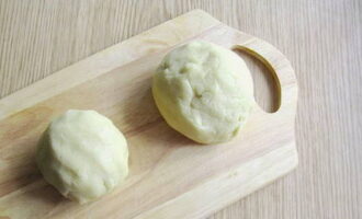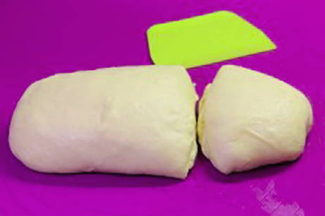 - Als het deeg klaar is, wikkel je je handen er omheen en verdeel je het in twee ongelijke delen.