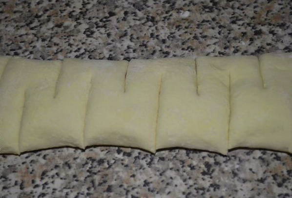 - Rol het tweede deel van het deeg uit en rol het tot een rol. Maak op de rol aan beide zijden over de gehele lengte insnijdingen.