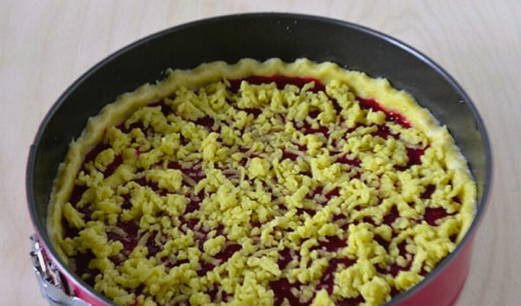 - Haal de bodem uit de koelkast, leg de eerder bereide bosbessenvulling erop. Rasp het tweede stuk deeg er bovenop.