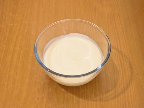 - Bereid de vulling voor. Klop de zure room en suiker los.