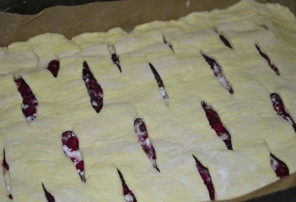 - Klop zure room met suiker en giet de resulterende massa bessen. Vouw de randen van het deeg naar het midden.