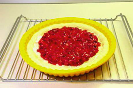 - Verdeel de bessen gelijkmatig over het deeg. Zet de schaal 20-25 minuten in een voorverwarmde oven op 180 graden.