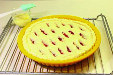 - Rol de rest van het deeg uit en snijd het in dunne reepjes. Leg de stroken kruiselings op de vulling. Klop de dooier los met de melk. Smeer de cake met het resulterende mengsel.