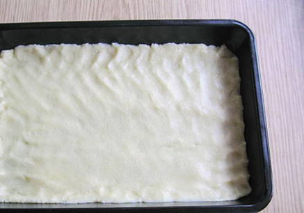 - Leg het deeg in een ingevette vorm, verdeel het deeg over het hele gebied, maak lage zijkanten.