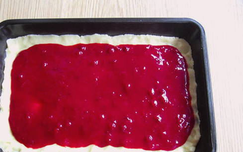 - Haal de bodem uit de koelkast, leg de eerder bereide bosbessenvulling erop. Rasp het tweede stuk deeg er bovenop.