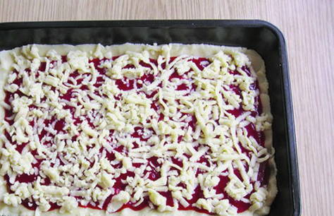 - Leg het deeg in een ingevette vorm, leg dan de wrongelvulling, giet de bessen erop, vermengd met een eetlepel suiker.