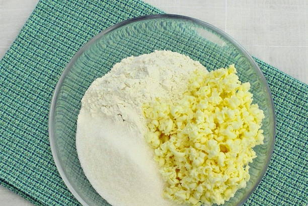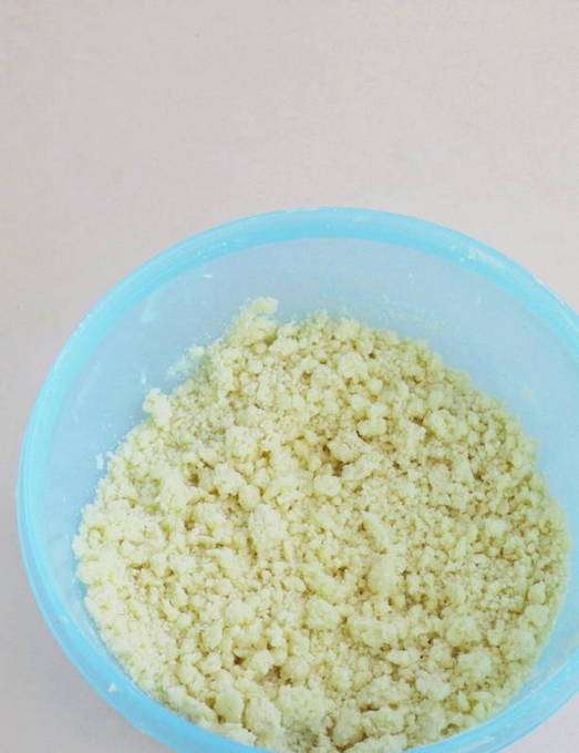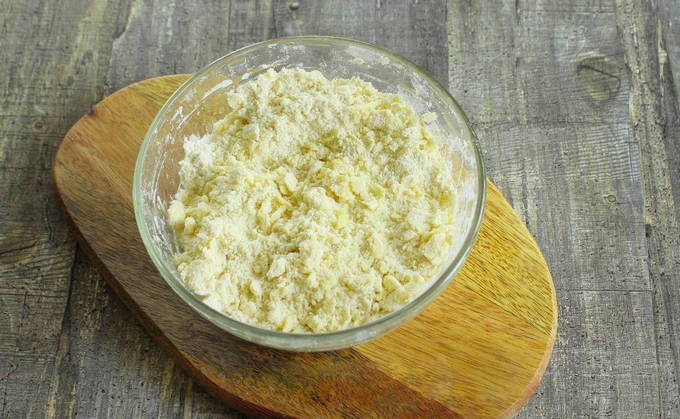 - Zeef bloem in een kom, voeg suiker toe en rasp de bevroren boter. Roer deze ingrediënten met je handen.