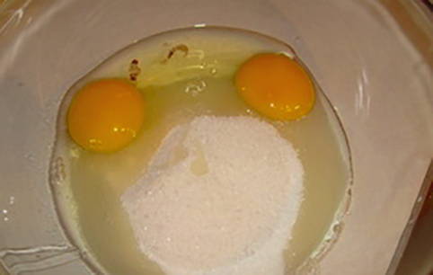 - Klop de eieren met suiker en vanillesuiker los in een kom.