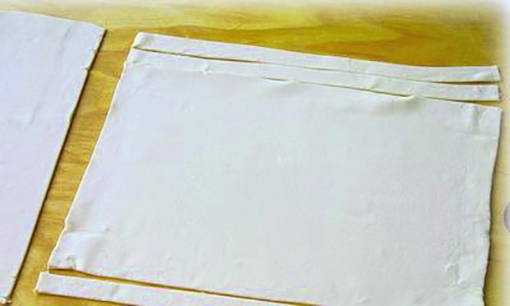 - Ontdooi het deeg volledig, rol het uit. Knip een rechthoek uit van 26x16 centimeter.