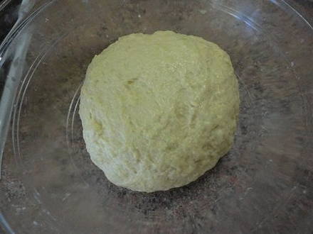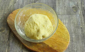 - Bloem zeven en mengen met gist. Combineer vloeibare en droge ingrediënten, kneed een homogeen deeg, laat het 1-1,5 uur op een warme plaats staan.