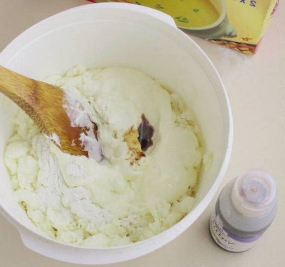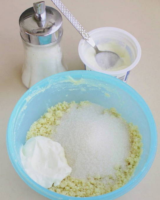 - Klop de kwark met suiker met een blender. Voeg zure room, vanille-essence, zetmeel toe en meng goed.
