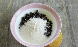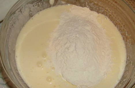 - Voeg vervolgens gezeefde bloem, bakpoeder en kefir toe aan een kom, meng de ingrediënten.