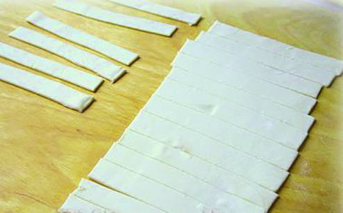 - Snijd de rest van het deeg in reepjes van 1-1,5 centimeter breed.