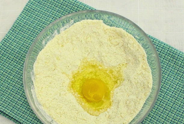 - Voeg het ei toe aan de kom, roer. Als het deeg niet goed tot een klont samentrekt, voeg dan een paar eetlepels ijswater toe.