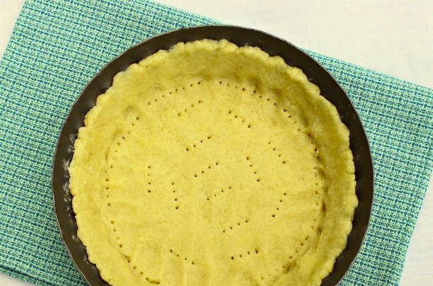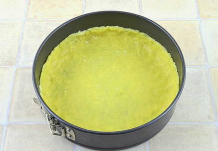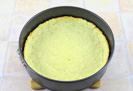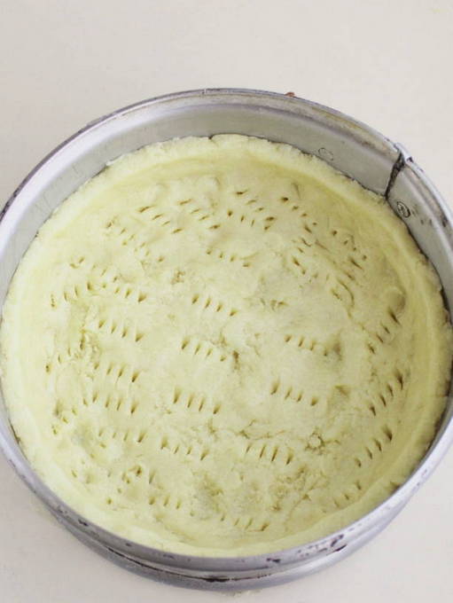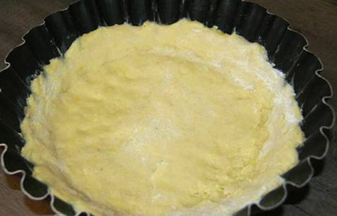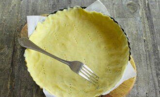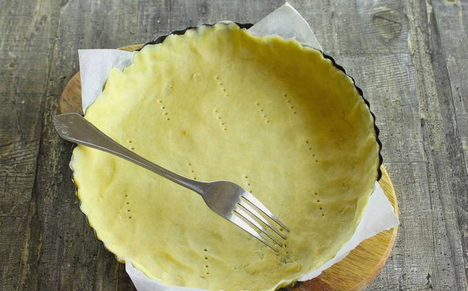 - Rol het deeg uit tot een ronde cake, doe het in een vorm, maak zijkanten en prik het in met een vork. Zet het werkstuk een half uur in de koelkast.