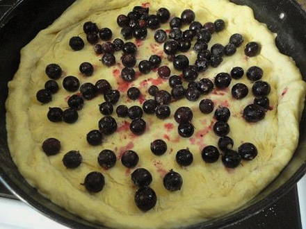 - Vet een ovenschaal in met boter. Doe het deeg in een vorm, vorm kleine zijkanten. Leg de zwarte bessen op het deeg.