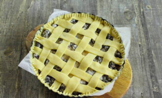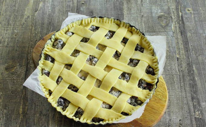 Rol het tweede deel van het deeg uit, snij in dunne reepjes en verdeel over de vulling. Houd de randen van het deeg bij elkaar.