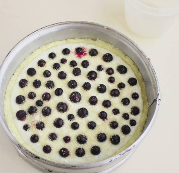 - Leg de wrongelvulling op het deeg, verdeel de zwarte bessen erover, druk deze lichtjes in de wrongelmassa en bestrooi met suiker.