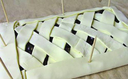 - Leg de deegstroken op de vulling, wikkel de randen van de bodem naar het midden toe en zet ze vast met tandenstokers.