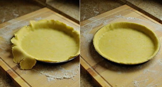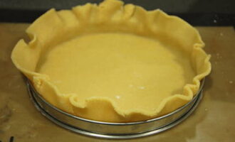 - Meng voor het deeg bloem met gehakte boter, voeg dan een ei en ijswater toe aan het midden, kneed goed. Wikkel het deeg in plasticfolie en leg het 15 minuten in de kou.