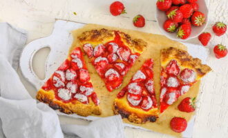 - Verdeel aardbeienstukjes over het centrale deel van het deeg en giet er zure room over. Bak de taart 30-40 minuten in de oven, eerder ingeschakeld op 200 graden.