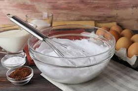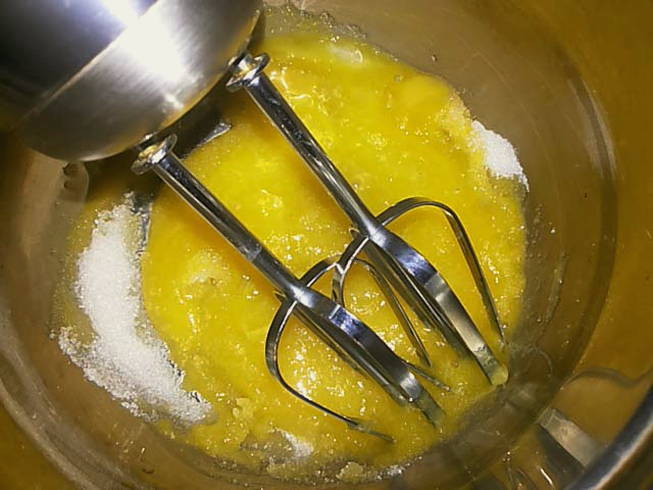 - Giet suiker bij de losgeklopte eieren en blijf kloppen tot de suikerkorrels verdwijnen.