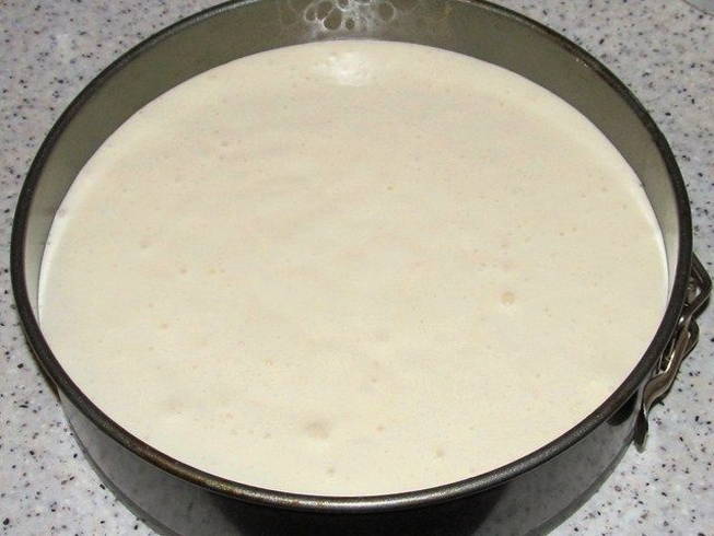 - Kneed het gerezen deeg een beetje en laat het nog 50 minuten warm staan. Verdeel daarna in twee delen - voor de basis van de cake en de decoratie. Rol een groter stuk deeg uit en leg het in een ovenschaal, met de zijkanten langs de rand.