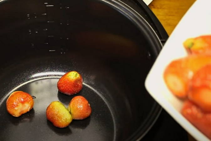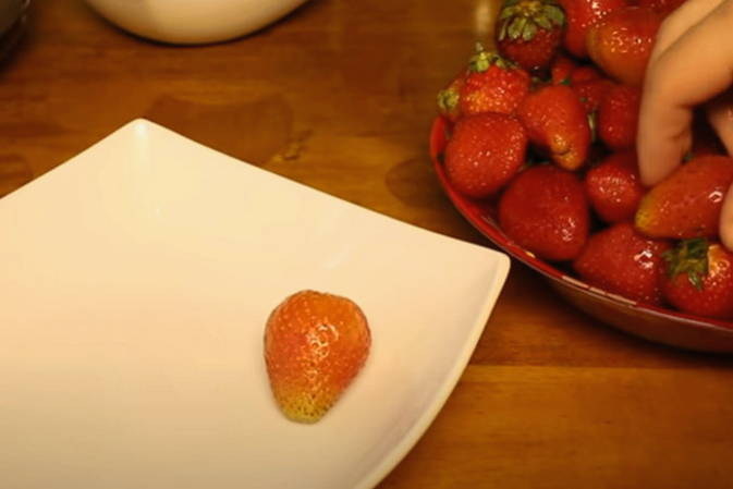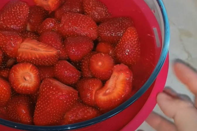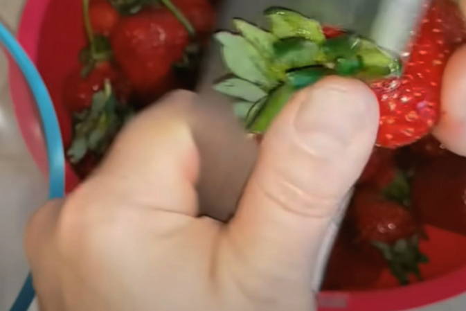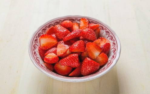 - Sorteer de aardbeien, verwijder de kelkblaadjes en de bedorven bessen.
